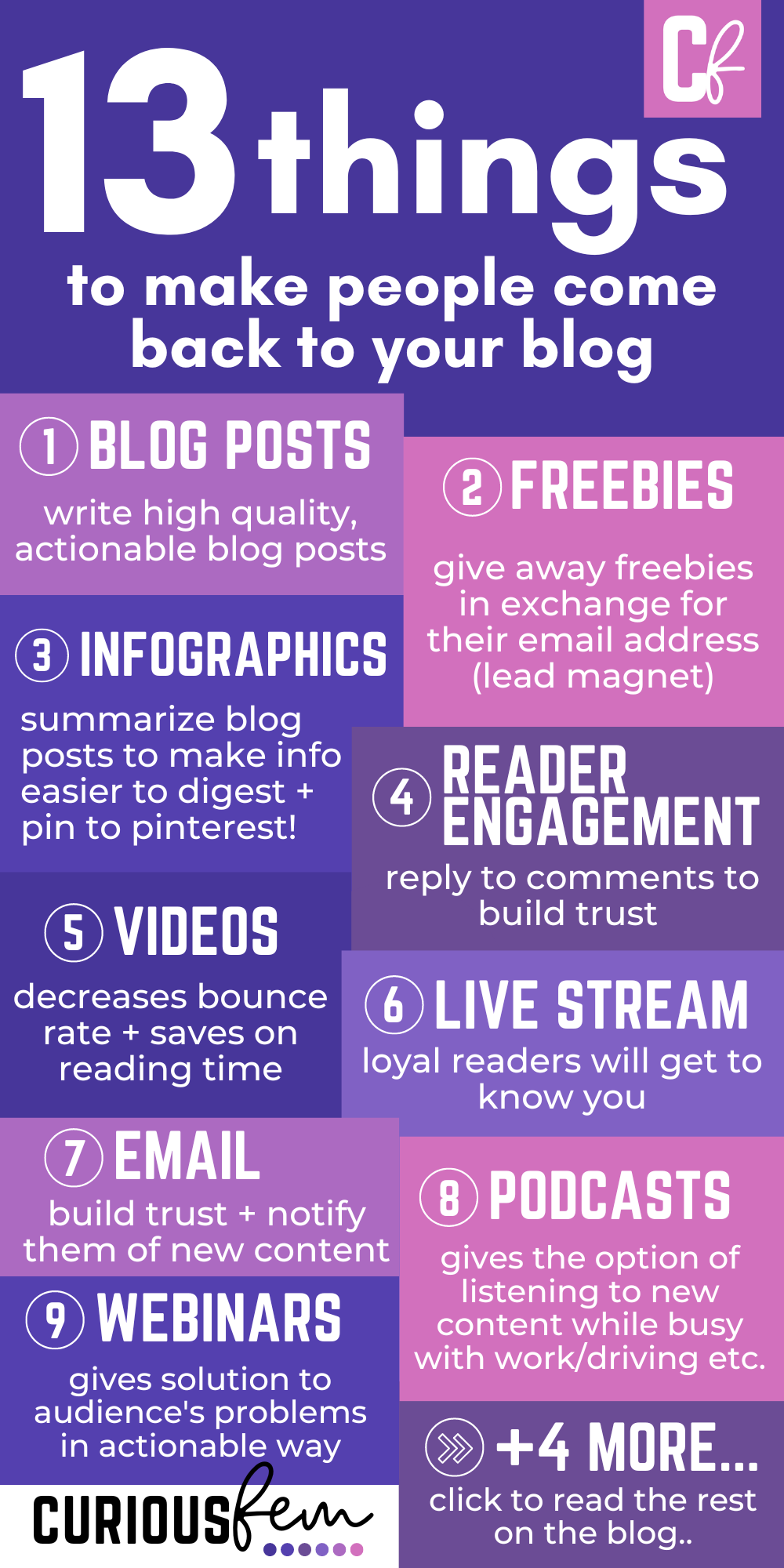 Podcasts are a great way for your audience to get to know you and your content, without having to read your blog posts. If you feel like creating podcasts, you can focus on certain aspects of your blog niche, or do an entire podcast series on a topic!